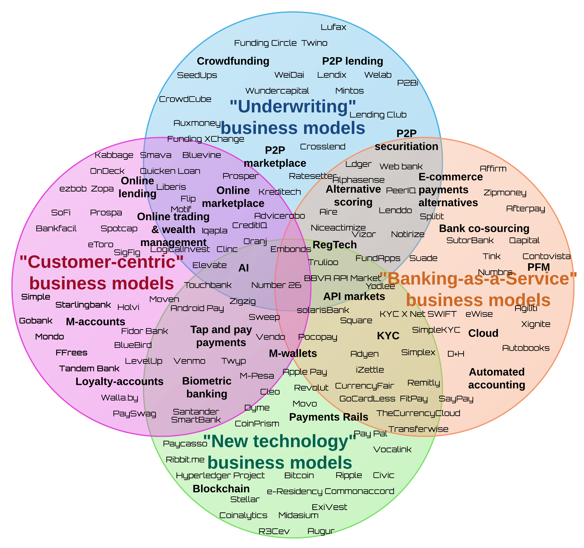 We tried to map quite a number of fin-tech companies and other products and services into a venn diagram in order to evaluate if such companies do have potential to surpass early stage of their life cycle. As nobody can doubt in their innovative potential, key problem for them is that clients in usage of banking services are conservative and innovative potential is not their key preference. Trust and stability are still important.